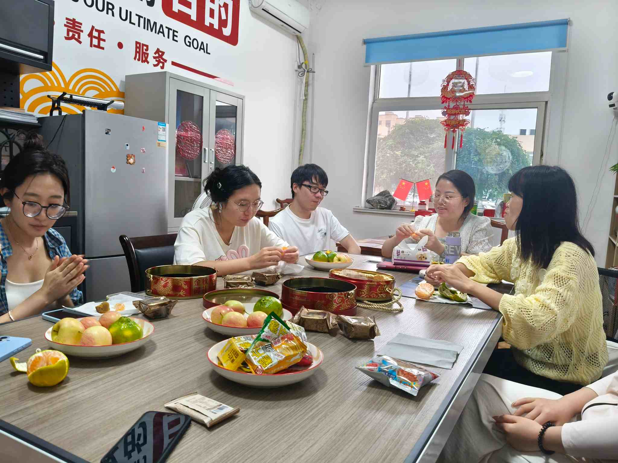 Tədbir saytında menecer WU əvvəlcədən geniş yemək hazırlamışdı: hər kəs üçün enerjini tez bir zamanda artırmaq üçün zəngin ləzzətləri olan, həm də təravətləndirici bir dad təcrübəsi gətirən təzə və dolğun mövsümi meyvələr. İşçilər müvəqqəti olaraq işlərini bir kənara qoyub birlikdə oturdular. Yeni bir həmkarına şirkətə qoşuldu, buna görə özümüzü bir-birimizlə tanış etdik. Bir-birimizi tanımadan sonra, hamısını şirkətin imza qəlyanaltı qutularına qoyduğu qəlyanaltılar paylaşdıq. Bu, yalnız iş yorğunluğu deyil, həm də yeni həmkarımın şirkətin böyük ailəsinin istiliyini, komandanın içərisindəki məsafəni daha da artırdığını hiss etdi.